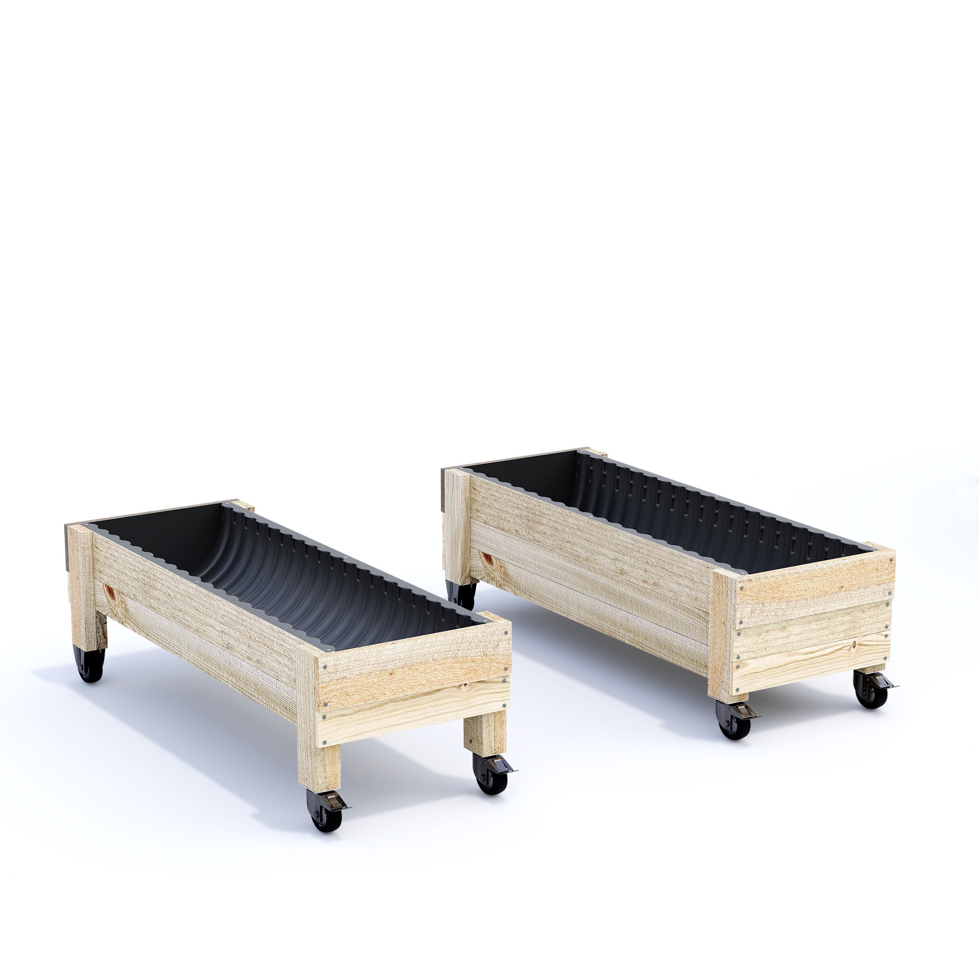 Outdoor castors are heavy duty with a combined capacity of 280kg (or 400kg for the large 41cm deep variations), with one end being fixed direction, and the other 360 degree swivel with brake - giving full and safe control to move your garden bed on any hard flat surface like a deck or on concrete.
